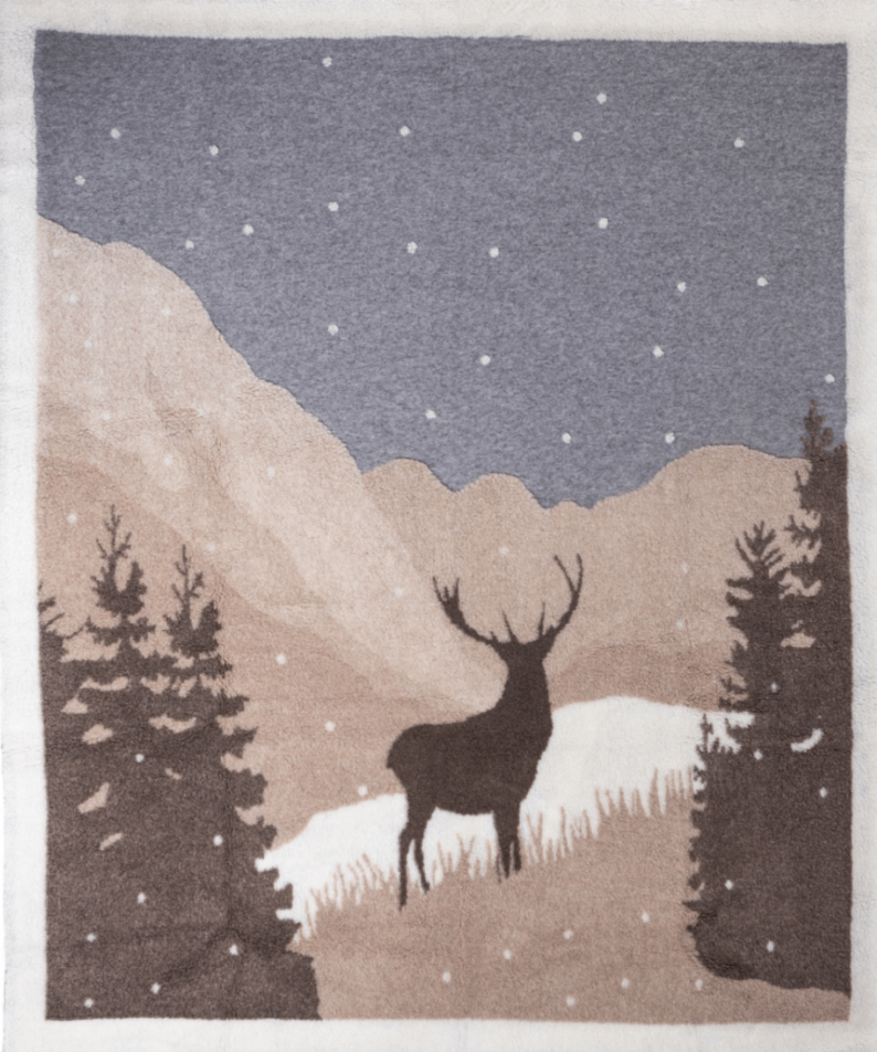 Un paesaggio silenzioso, un cervo maestoso e la magia della neve che cade leggera: la coperta “Cervo sotto la Neve” racchiude tutta la poesia dell’inverno.