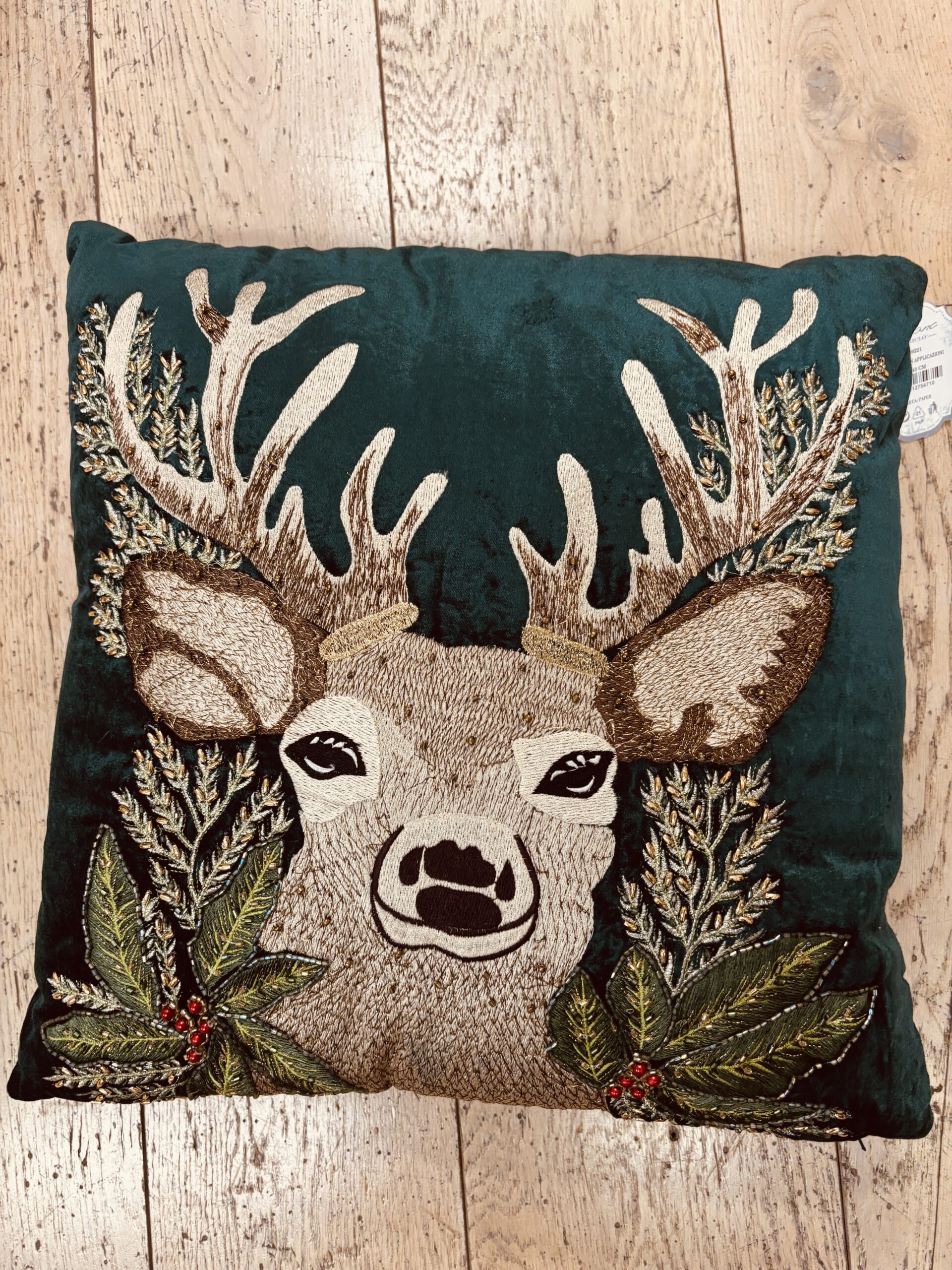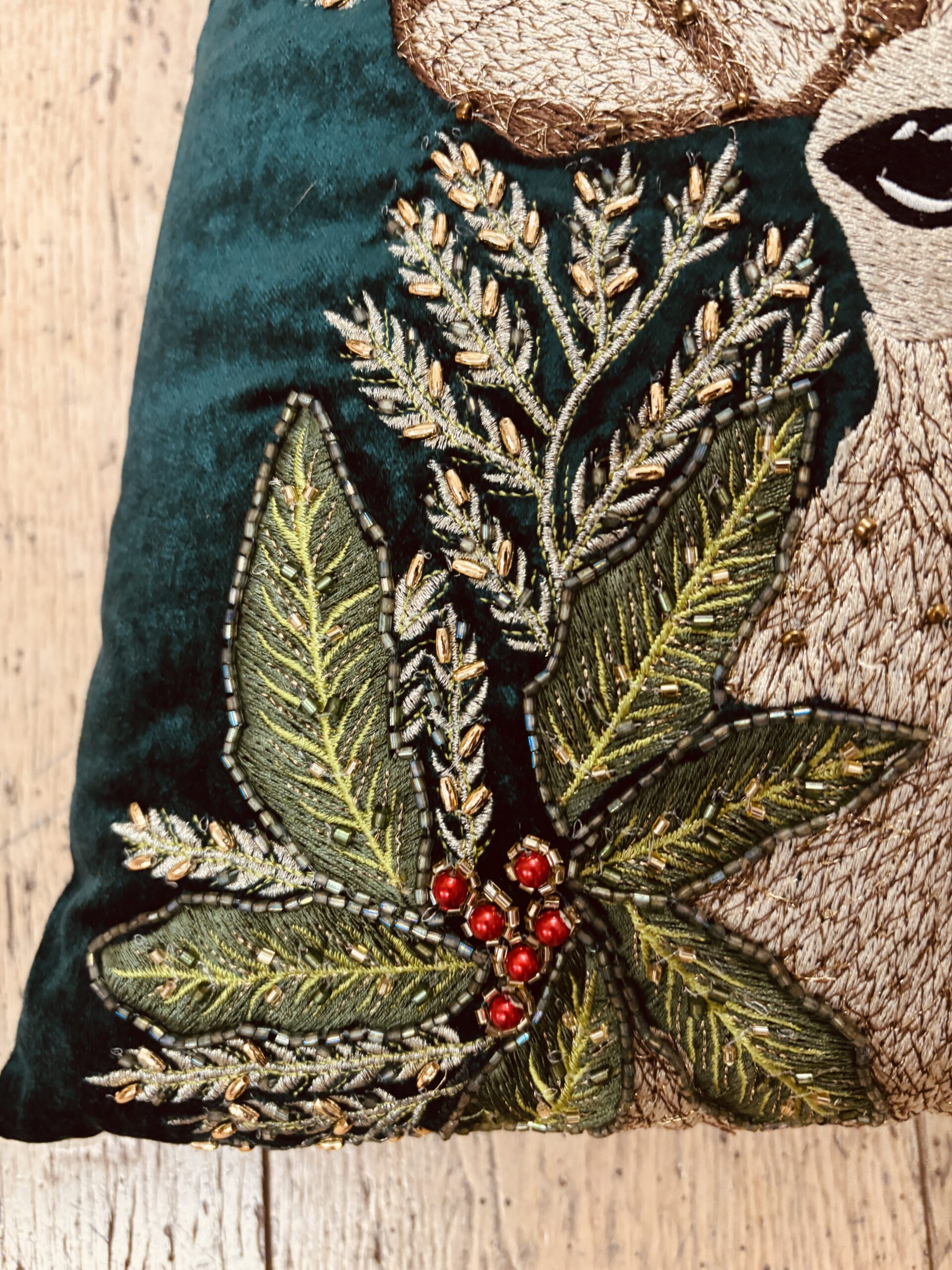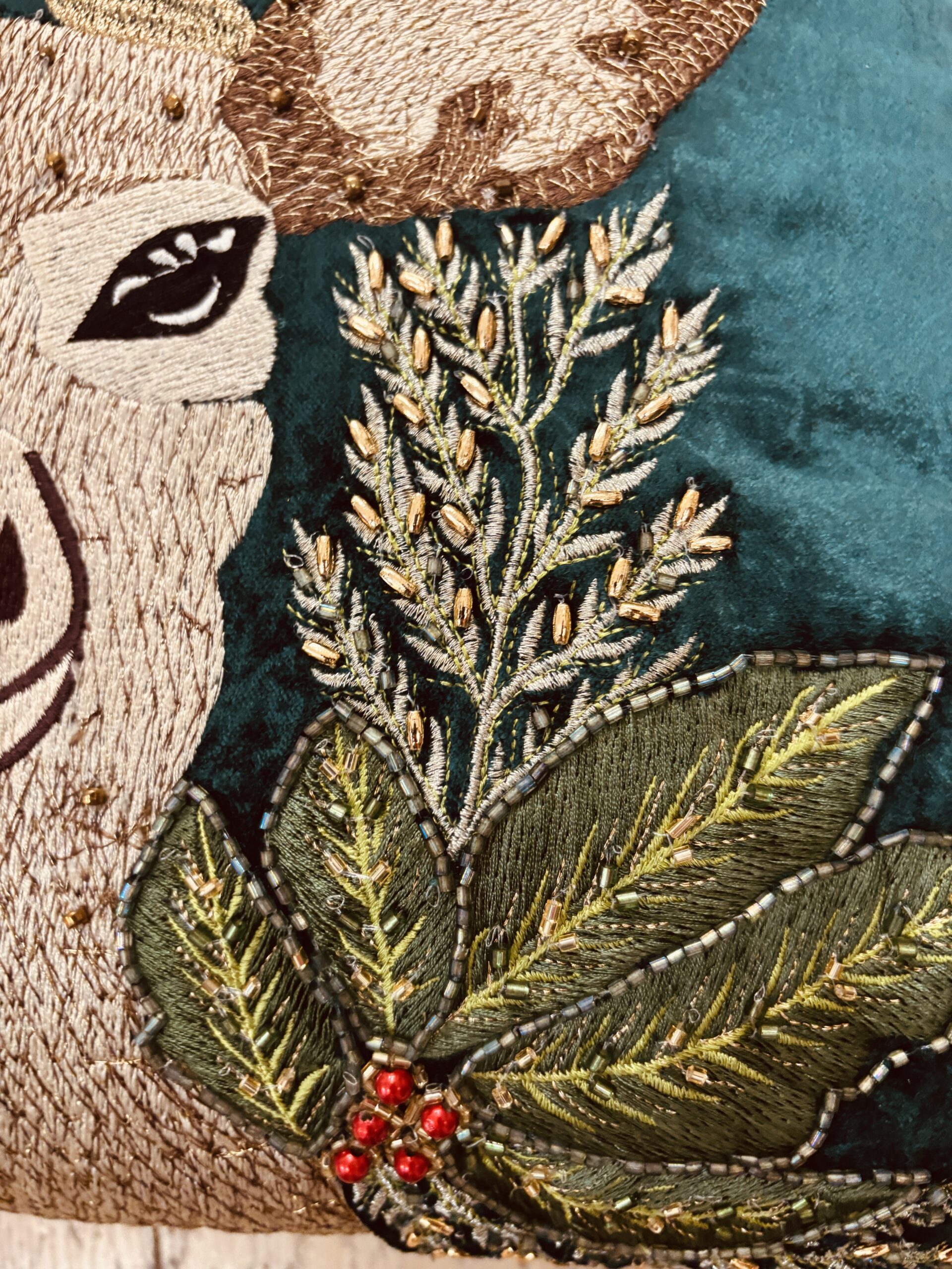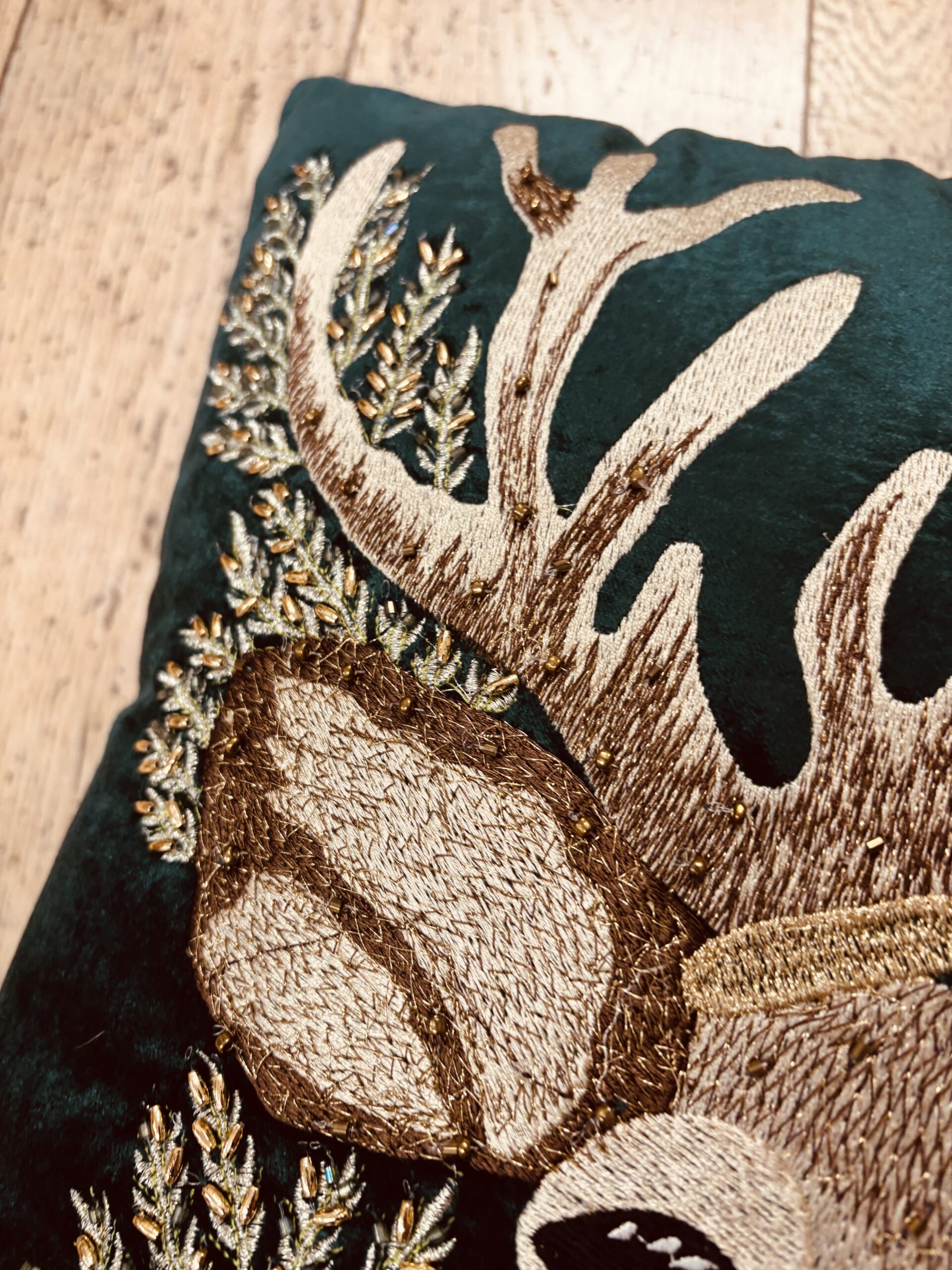 Un cuscino scenografico e raffinato che porta immediatamente un’atmosfera calda, accogliente e montana all’interno della casa. Realizzato da Blanc MariClò, questo elegante cuscino in velluto verde profondo è arricchito da un magnifico ricamo del cervo, curato nei minimi dettagli con filati dorati, marroni e naturali che donano profondità e luminosità al disegno.