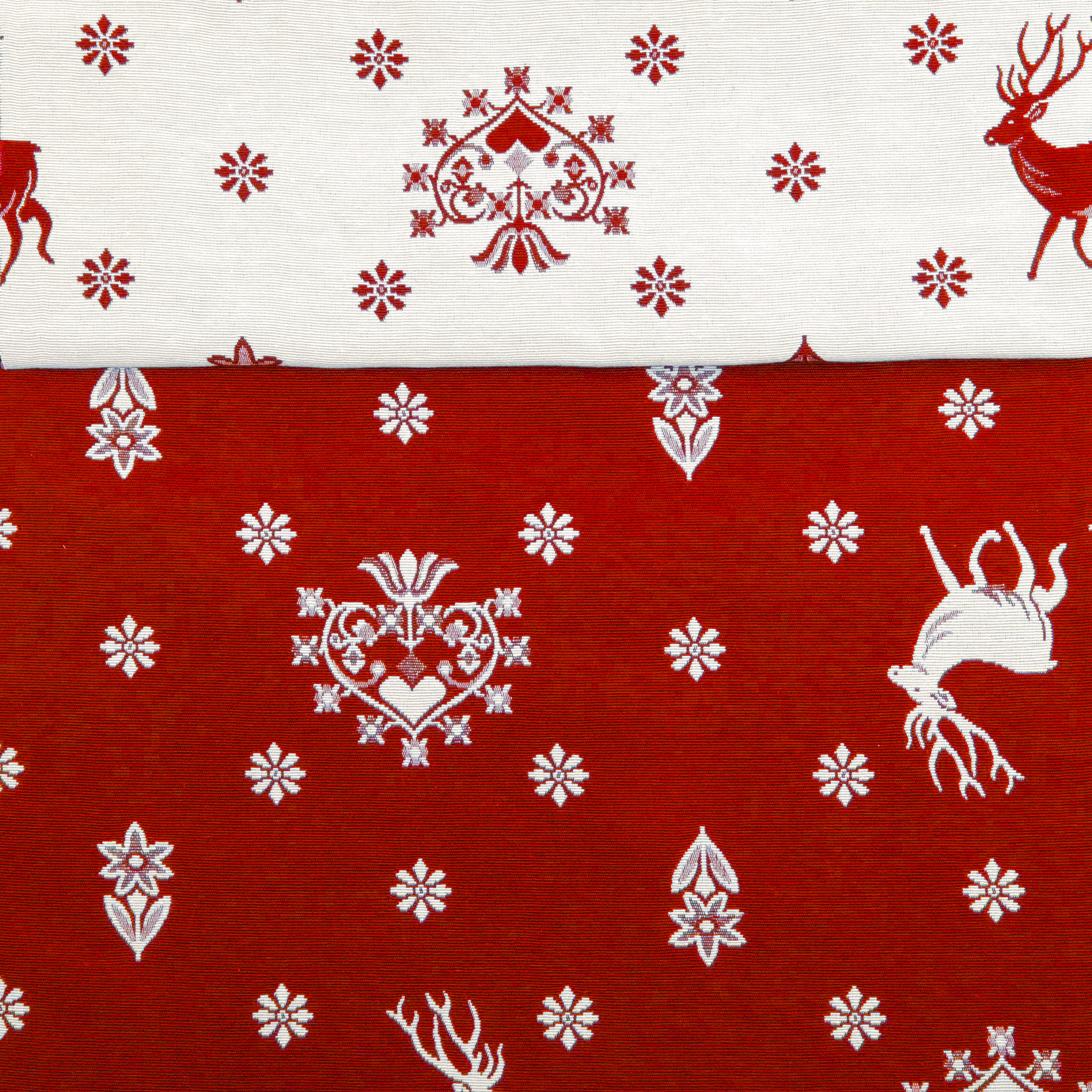Cuscino decorativo in tessuto jacquard, con raffinato motivo montano che unisce cuori, fiordalisi e cervi stilizzati. Un design tradizionale reinterpretato in chiave elegante, ideale per donare calore e stile agli ambienti di montagna o a una casa dal gusto naturale.