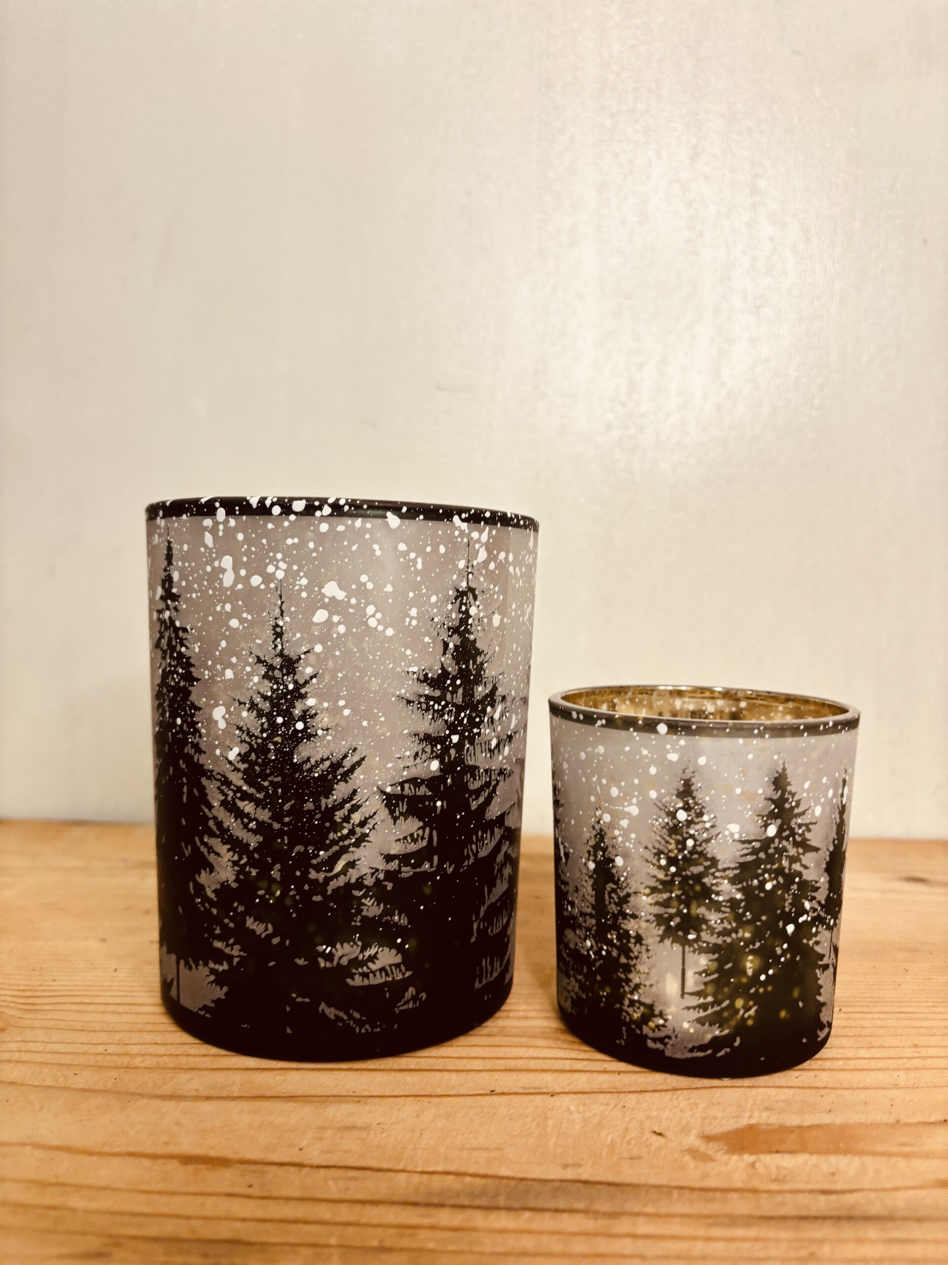 Porta tealight in vetro decorato con una scena invernale avvolgente: un bosco di abeti immerso nella neve, illuminato delicatamente dalla luce della candela. Quando il tealight è acceso, il decoro prende vita creando un’atmosfera calda, quieta e suggestiva, perfetta per i mesi invernali o per aggiungere un tocco nordico alla casa.