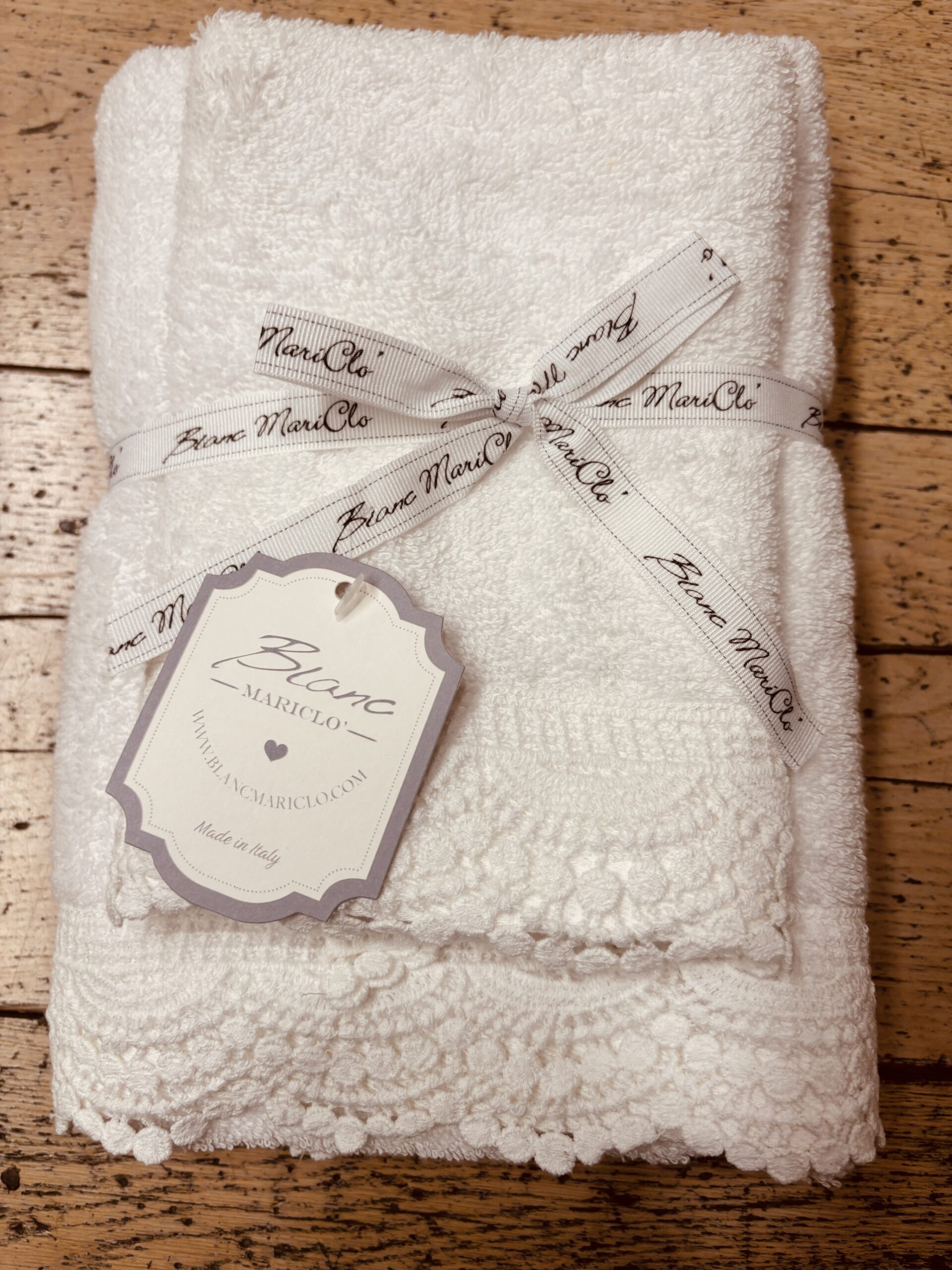 Set da 2 asciugamani Blanc Mariclò rifinito con un romantico bordo in crochet con piccoli pallini, delicato e perfetto per bagni eleganti e raffinati.