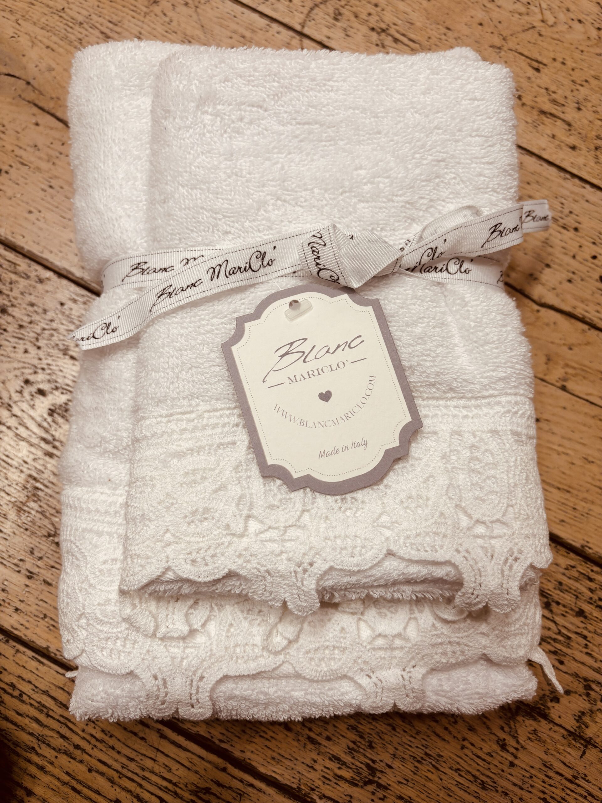 Set da 2 asciugamani Blanc Mariclò con ampia fascia in pizzo ricamato floreale, ideale per bagni shabby chic e raffinati. Spugna morbida e piacevole sulla pelle.