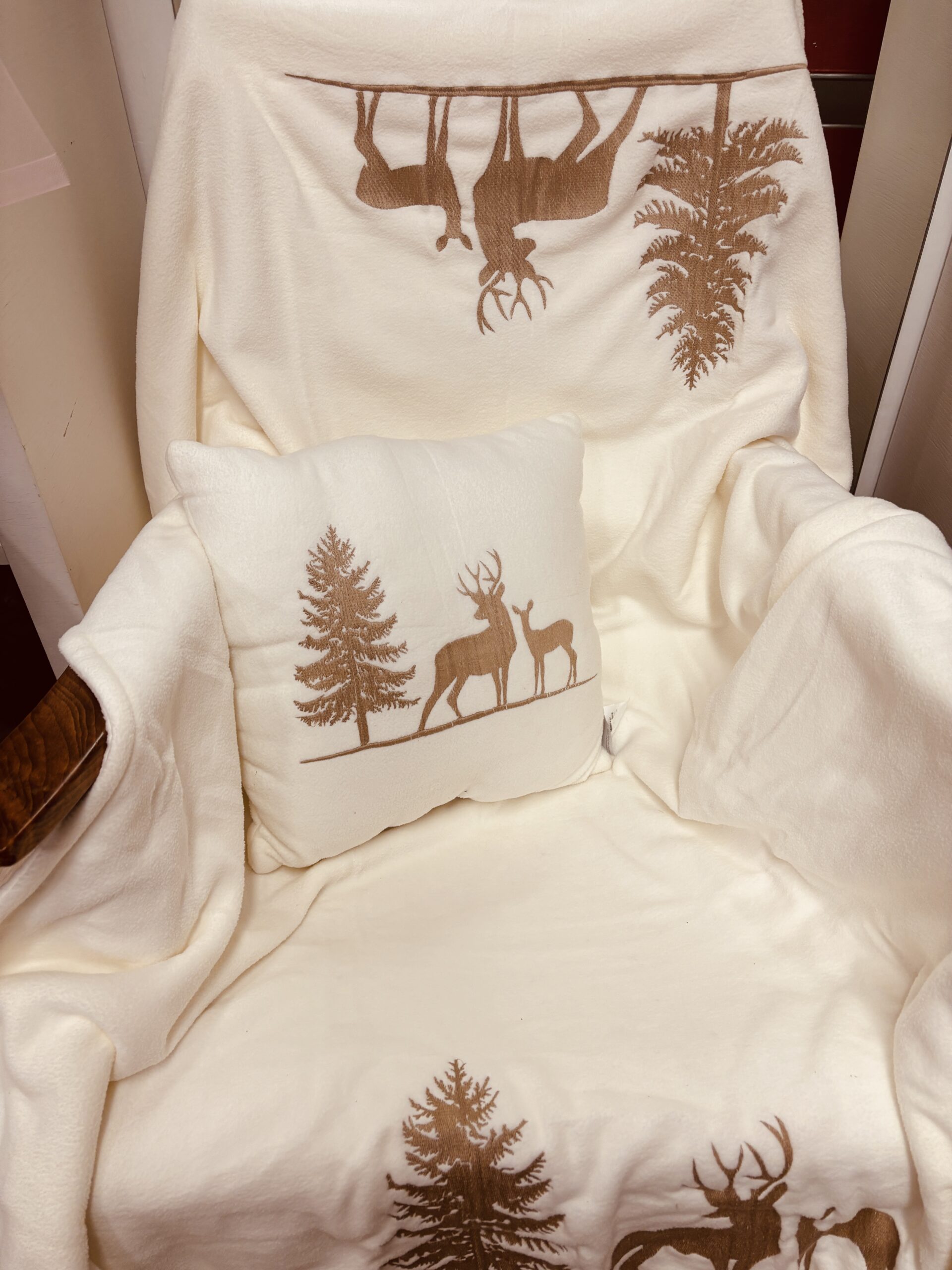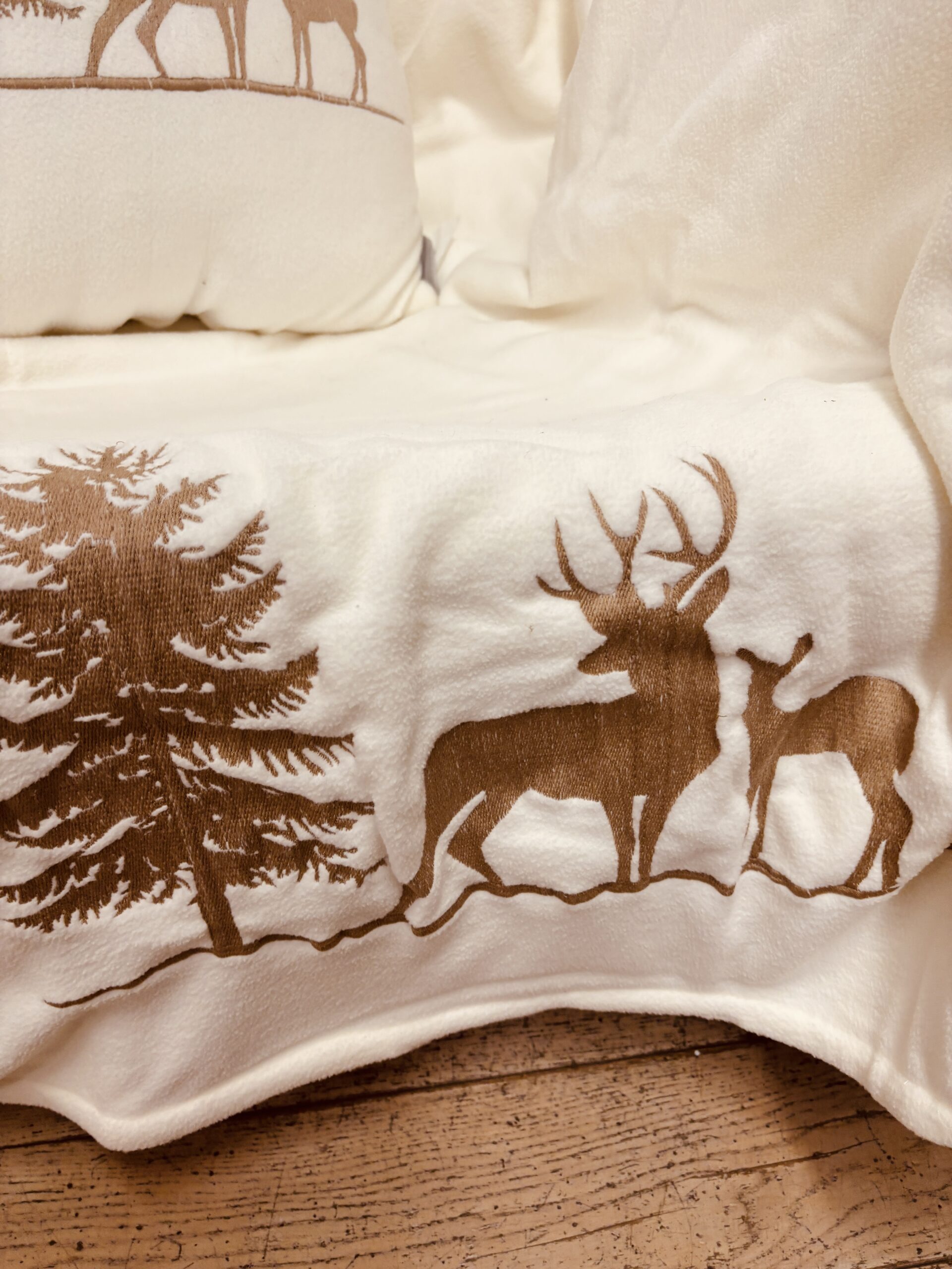 Il Plaid in morbido pile color avorio è decorata da un raffinato motivo jacquard che raffigura cervi e abeti nelle tonalità del marrone caldo, perfetto per creare un ambiente accogliente, rustico ed elegante.