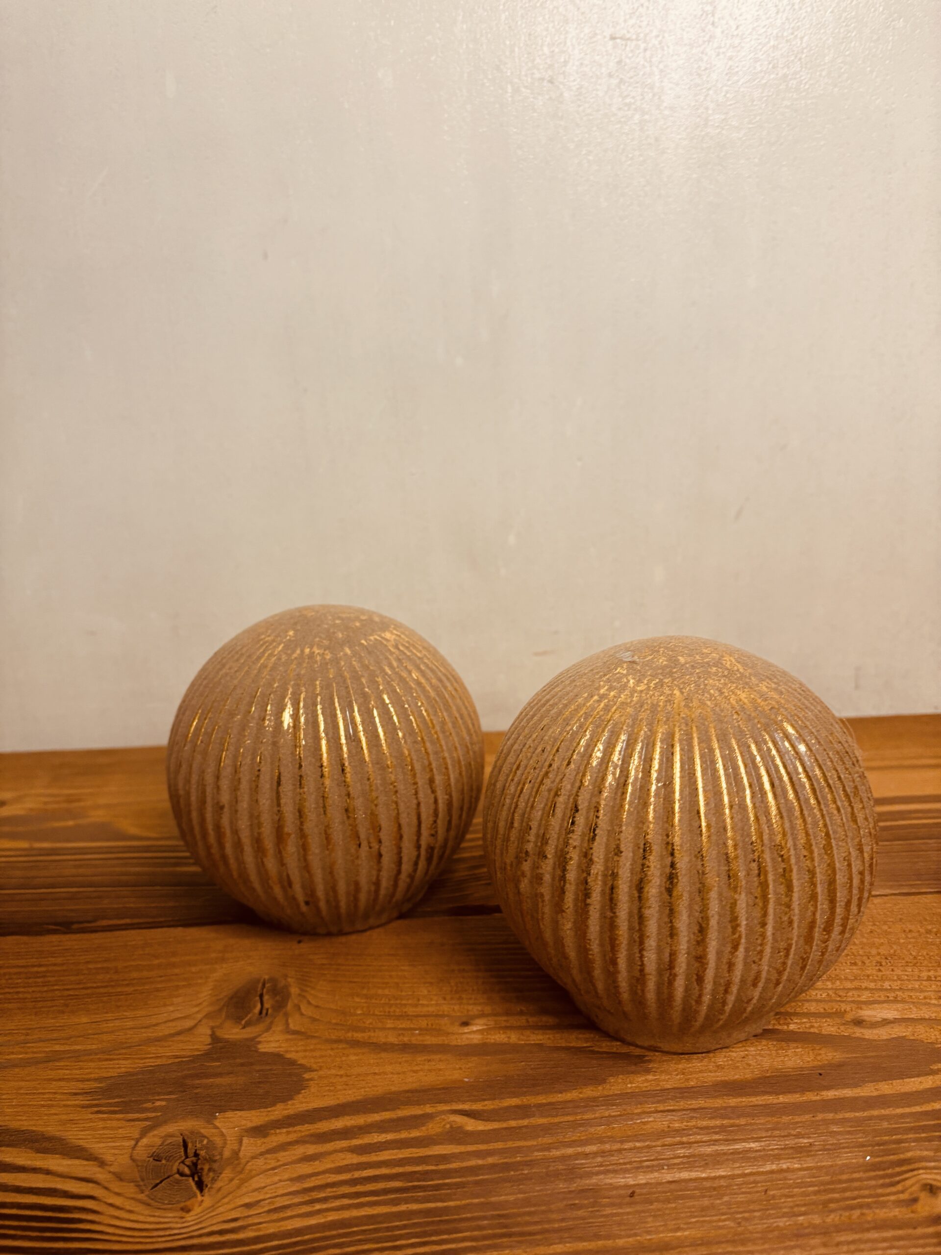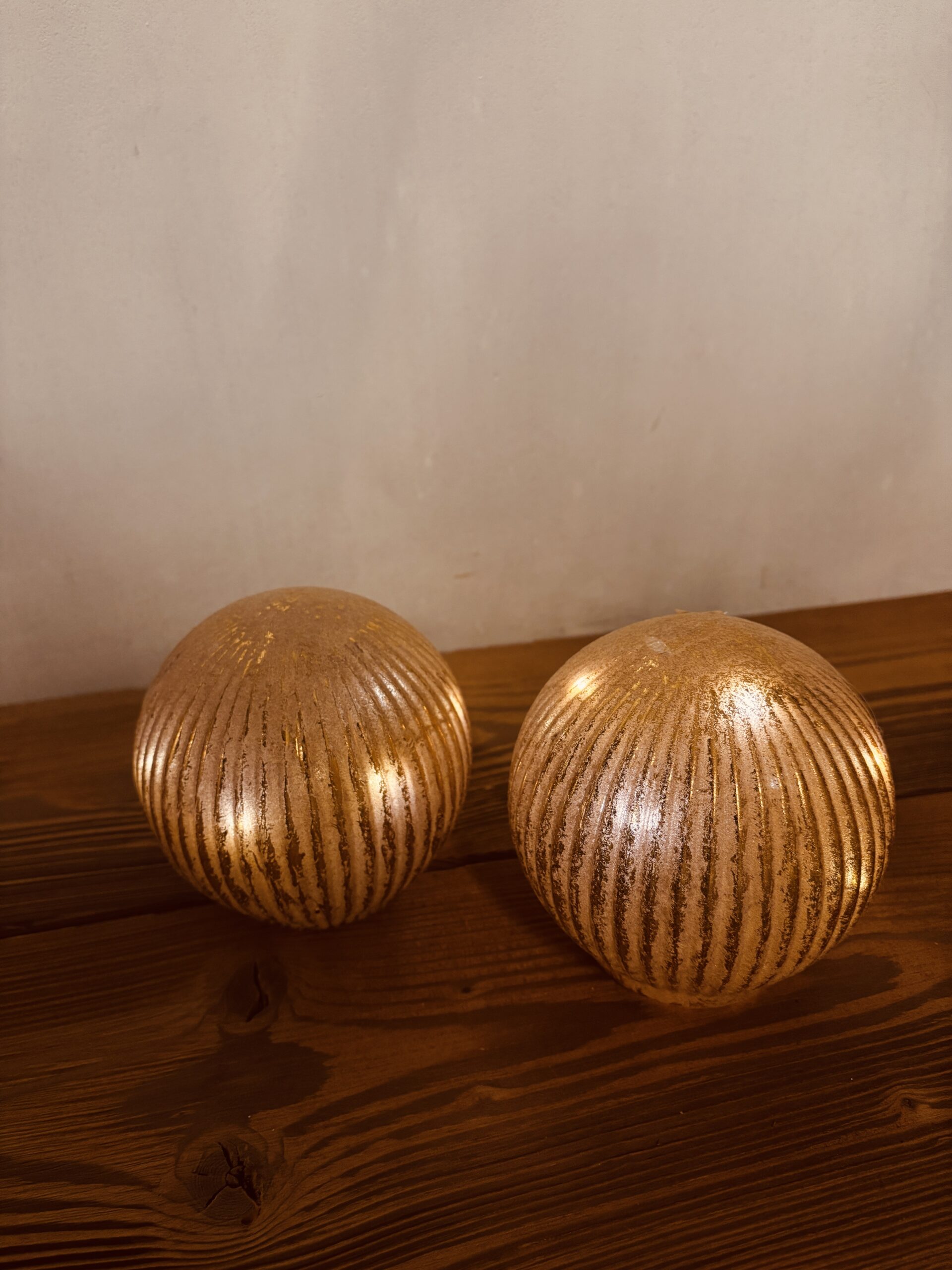 Raffinate sfere decorative dal diametro di circa 14 cm, realizzate in plastica rigida di alta qualità con elegante finitura dorata effetto metallico.