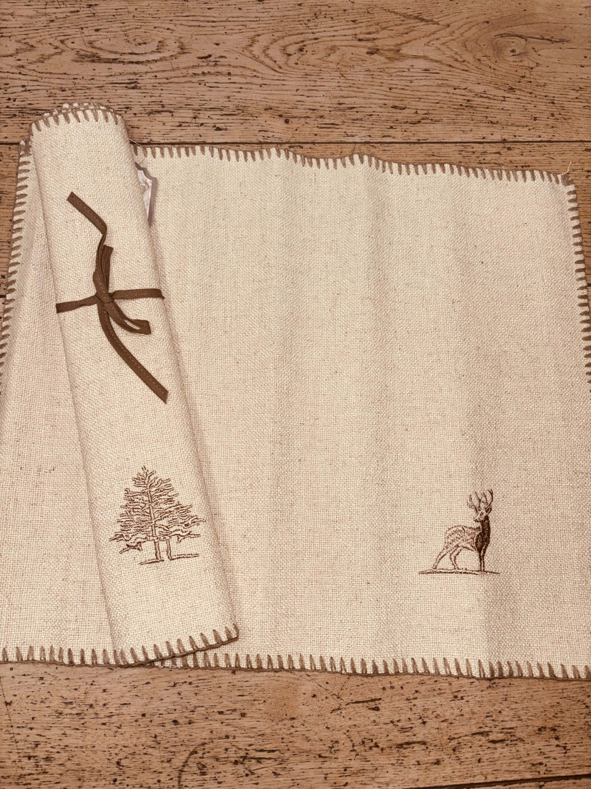 1. Cervo ricamato: elegante e minimale, perfetto per una mise en place in stile chalet o rustico.